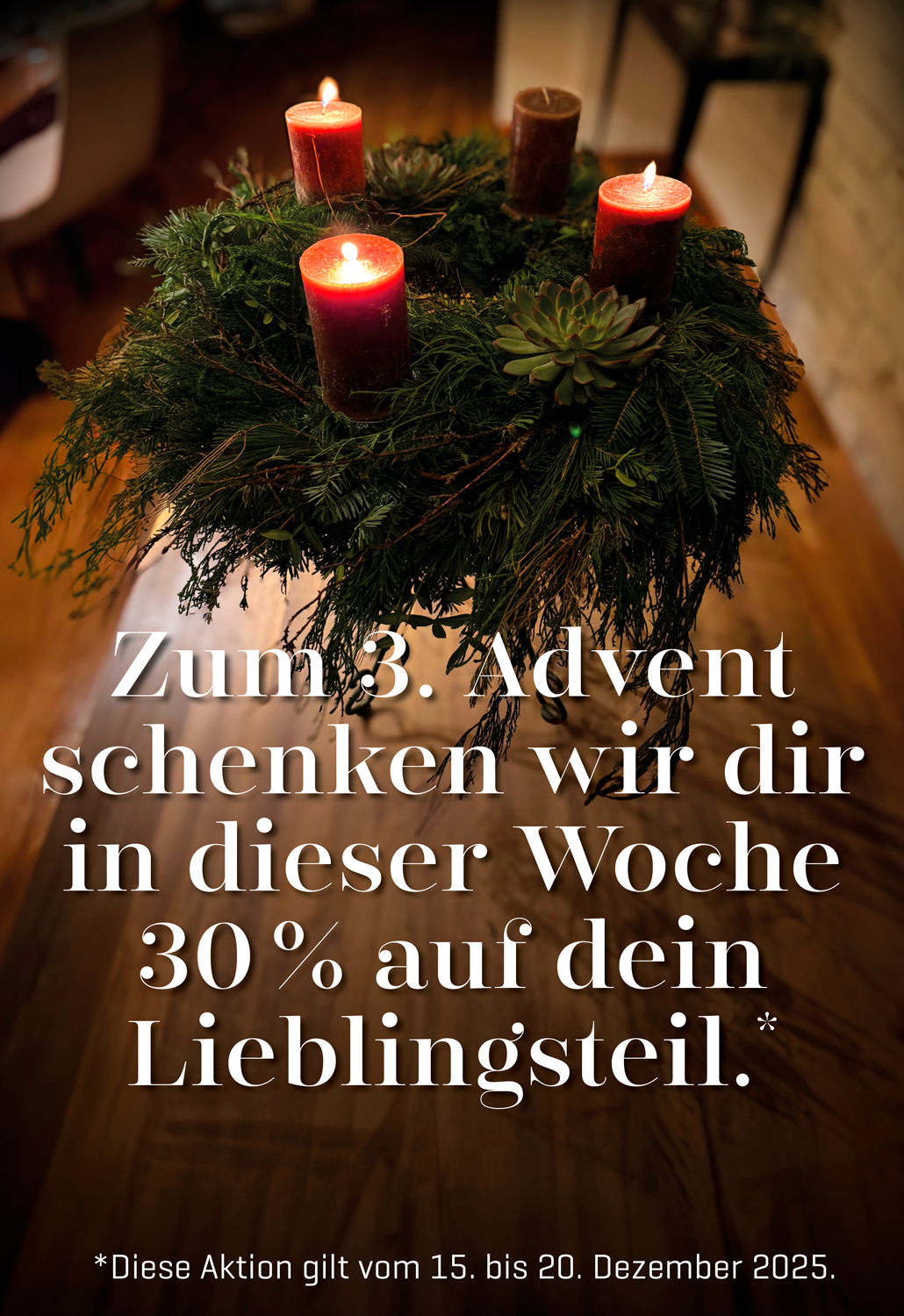Zum 3. Advent schenken wir dir vom 15. bis 20. Dezember 30 % auf dein Lieblingsteil.